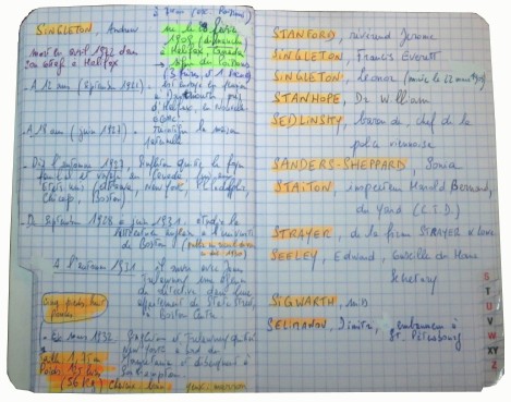 Juste après la parution du Diable du Crystal Palace, j’ai ressenti la nécessité de concevoir pour mon usage personnel un dictionnaire des personnages. Rédigé sur un carnet type « répertoire alphabétique », son intérêt premier est de pouvoir vérifier aisément, au moment de créer un nouveau protagoniste, que je n’ai pas déjà utilisé le nom, ou que celui-ci n’est pas phoniquement trop proche d’un autre existant. À l’occasion de la mise en ligne de ce document de travail, j’en ai profité pour l’enrichir quelque peu. À ce jour, il compte plus de 130 entrées.